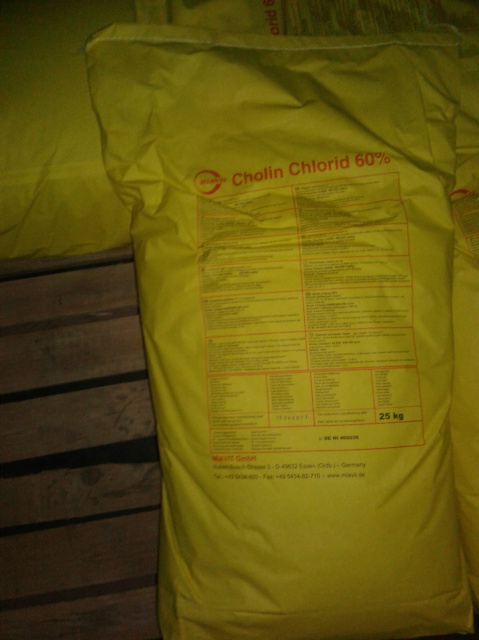 Опис : Холін-хлорид 60% – використовується у виробництві преміксів і комбікормів в якості джерела холіну (провітаміну В4), який виконує в організмі життєво важливі функції і має суттєвий вплив на здоров'я і продуктивність молодняку і дорослого поголів'я.